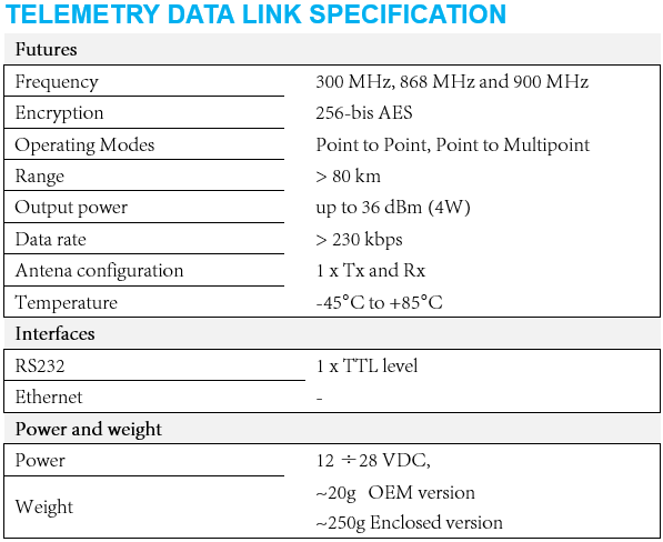 If only telemetry data transmission is required and the application is sensitive to payload size, consider a smaller module with a single antenna, excellent throughput, data encryption and an operational range of up to 80km LOS.